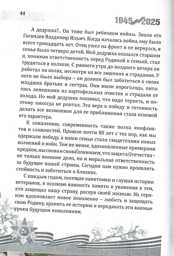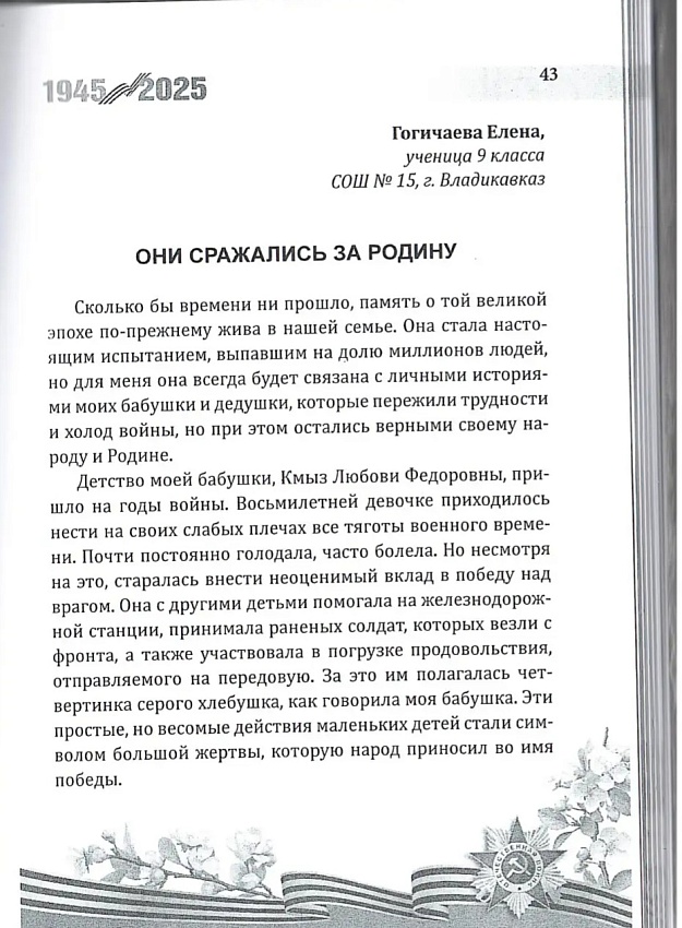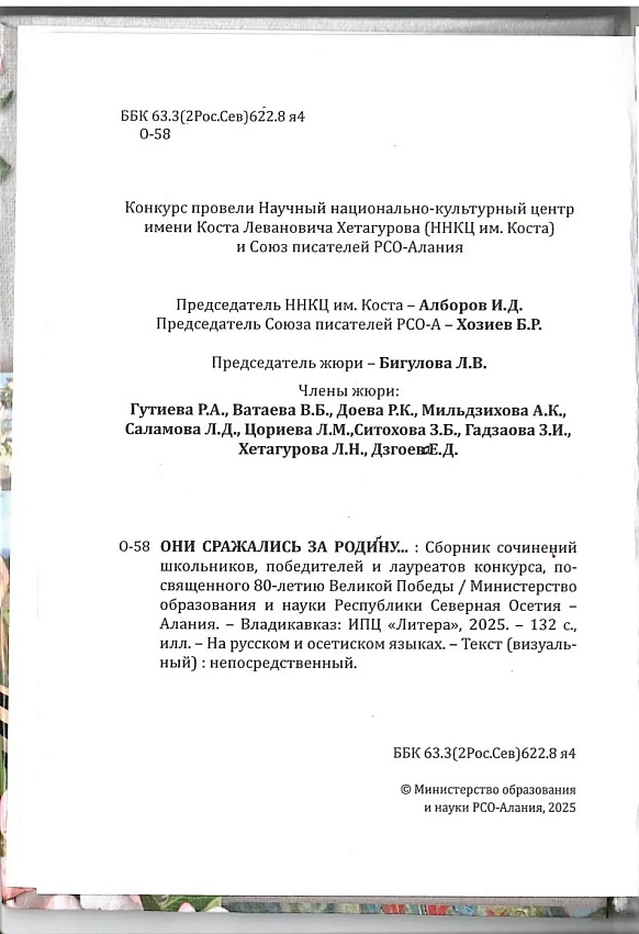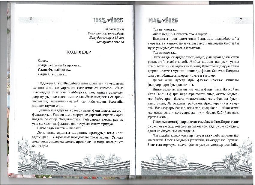 Два сочинения обучающихся 10а класса нашей школы Гогичаевой Елены и Багаевой Яны вошли в сборник сочинений школьников, победителей и лауреатов конкурса, посвященного 80-летию Великой Победы "Они сражались за родину". Конкурс провели ННКЦ им.Коста и Союз писателей РСО- Алания. Среди членов жюри также учитель осетинского языка нашей школы Ситохова З.Б.